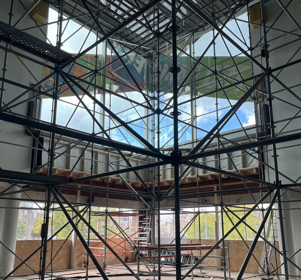 Na de presentatie van ons interieurontwerp zijn nu de eerste zichtbare stappen gezet richting een nieuwe ‘huiskamer’ van de democratie voor de Amsterdammers. De centrale hoek is inmiddels voorzien van een glazen pui die straks prachtig uitzicht geeft op de Amstel.